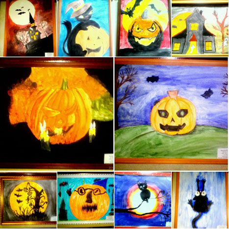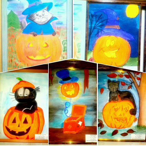 Юные художники под руководством Лугиной Александры Юрьевны, Мясоедовой Татьяны Николаевны нарисовали яркие тыквы, призраков и привидений, черных кошек, летучих мышей, пауков и других существ так или иначе связанных с миром нечистой силы приуроченной к празднованию Хэллоуина.